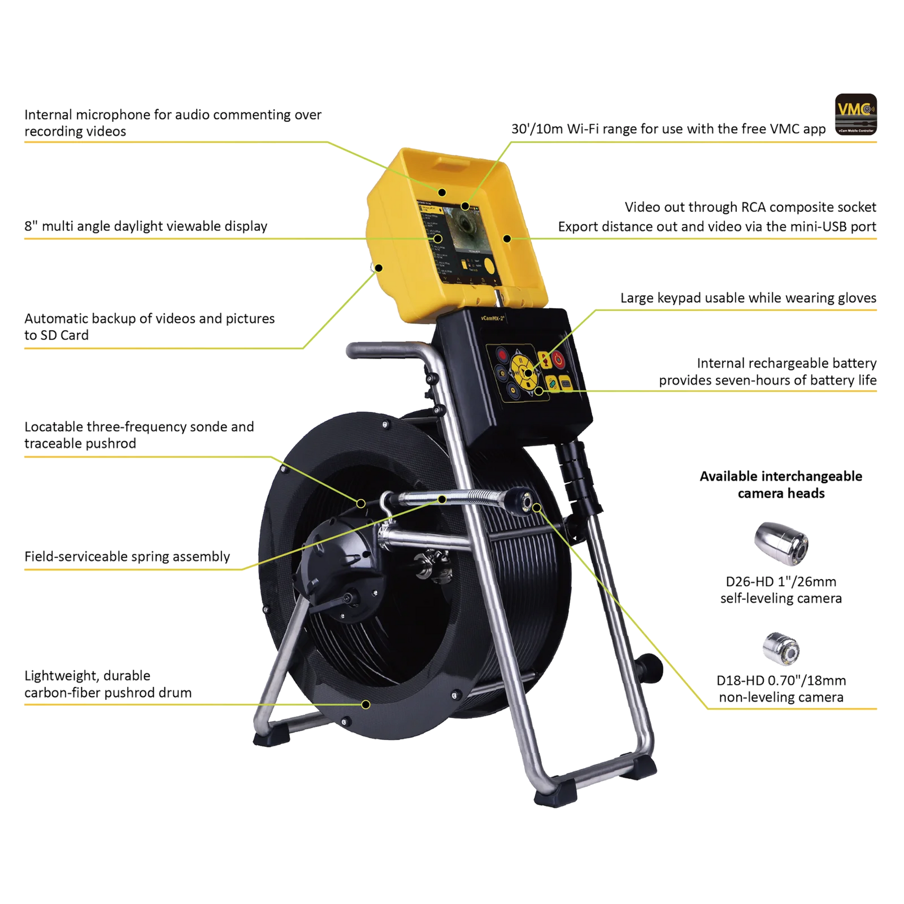 The D-18 head is an 18mm non self-leveling head that can get you into pipes between an inch and a half to 4 inches of diameter. The D-26 head is a 26mm self-leveling High Definition head that allows you to get into 2-4 inch pipes. Both heads are stainless-steel housed with Sapphire lenses which makes them more resilient.