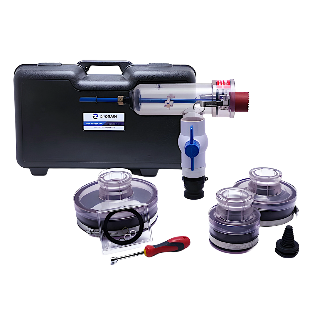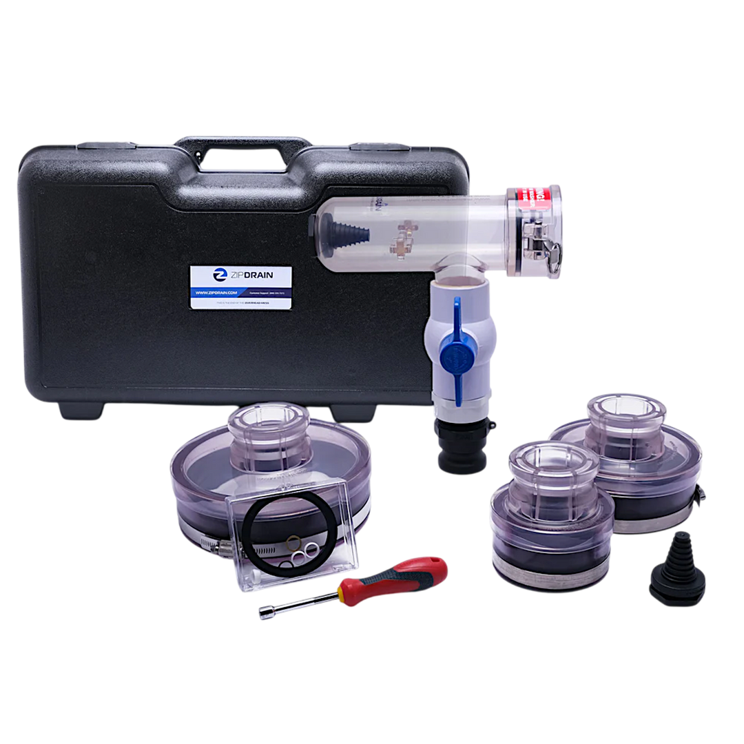 ZipDrain is simple and easy to use, and puts you back in control of those pesky overhead drains. The universal body is made from impact resistant ABS plastic so it can stand up to even the toughest jobs. With three sizes of heads included, ZipDrain can be used in almost any situation and works with cast iron, PVC, and copper cleanouts. Using ZipDrain, you can drain the system, remove the clog, and dispose of the sewage, all in less than an hour. Thanks to ZipDrain, there’s no more mess.